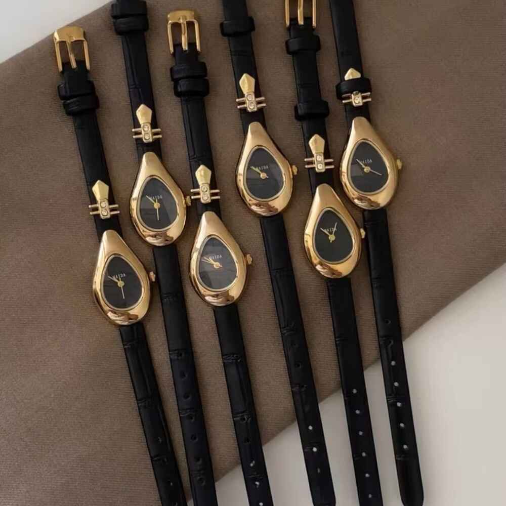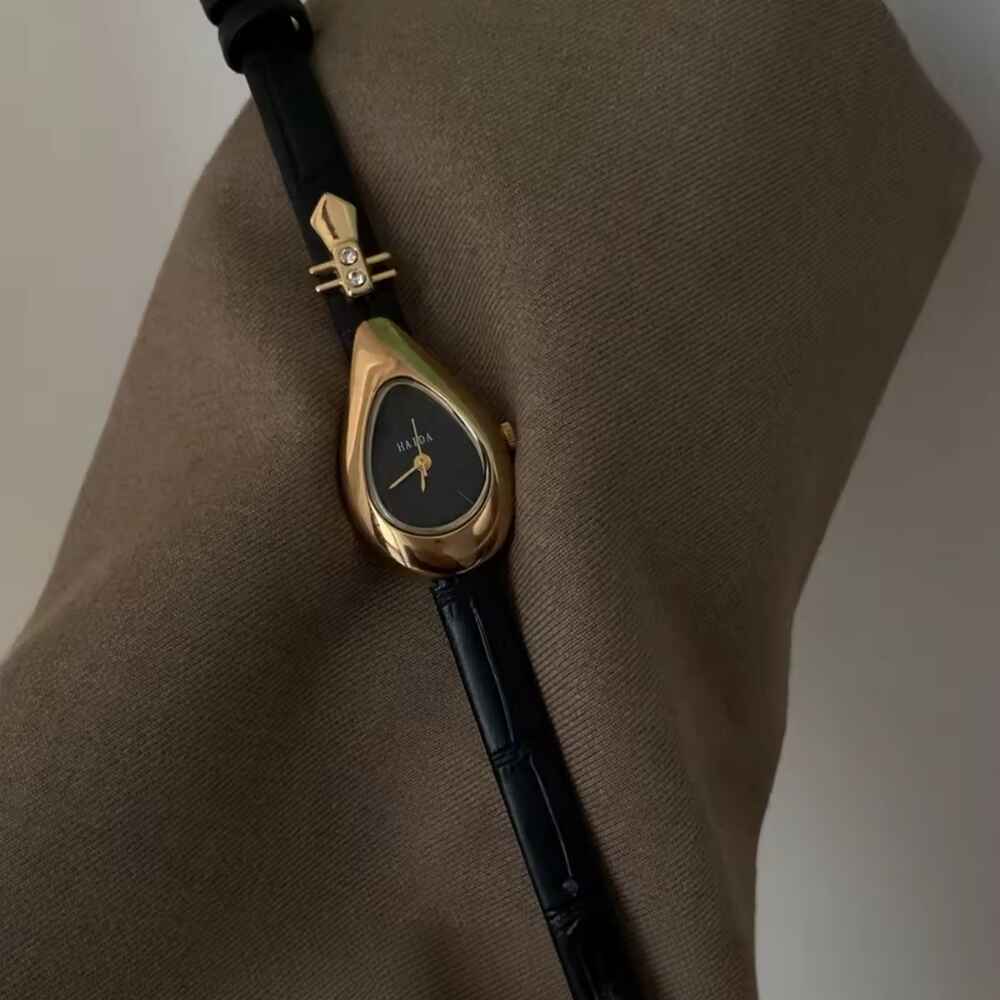 Bijou: A Unique Expression of You. This drop-shaped watch features a gold-tone brass case, black dial, and genuine leather strap, blending elegance with personal style. Water-resistant up to 30 meters, it’s perfect for every occasion.